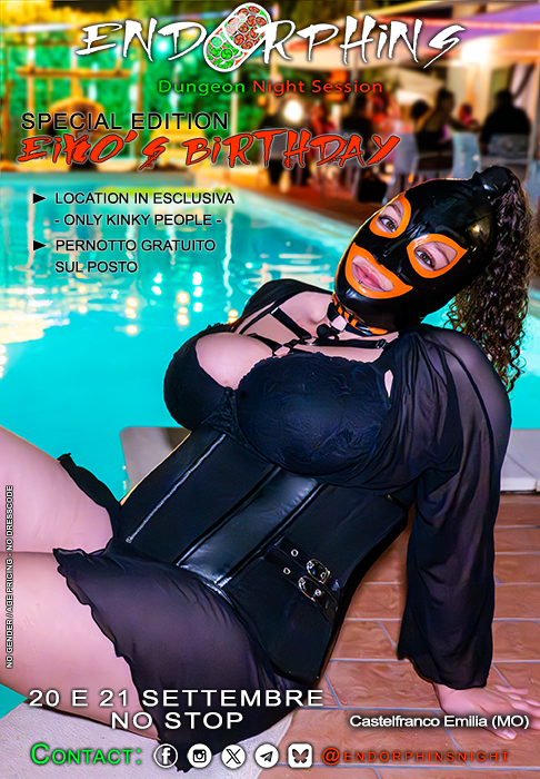 Endorphins non è solo un party: è un viaggio sensoriale in cui il confine tra mente e corpo si dissolve, lasciando spazio alla pura intensità dell’esperienza. Qui ogni gesto ha un significato, ogni tocco una promessa. Che siate Dom, sub, switch o semplici curiosi, troverete uno spazio sicuro, rispettoso e liberamente consapevole per esplorare ciò che vi accende davvero.